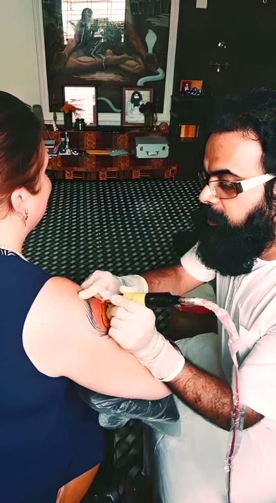 Swamiji giving a tattoo in 2017